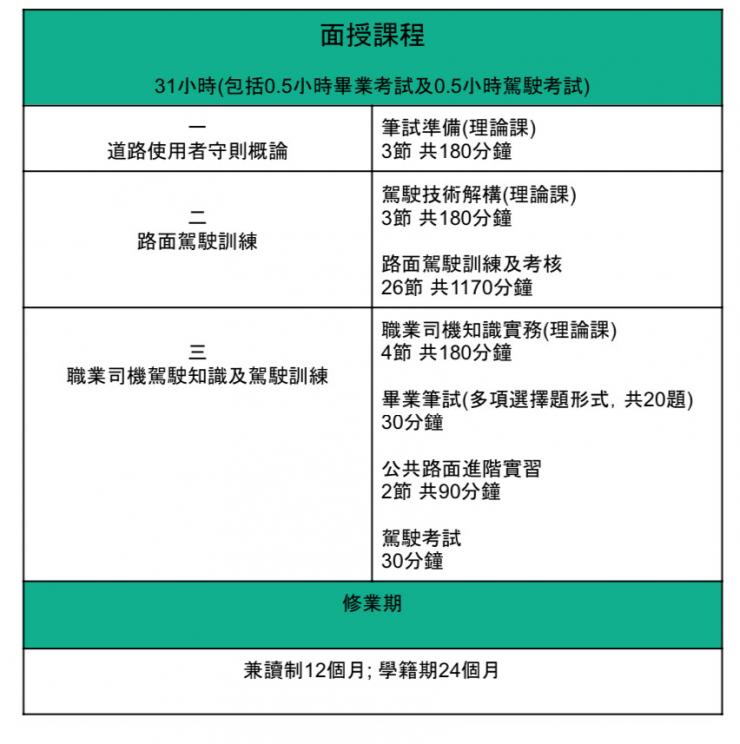 - 於駕駛實習(包括:「學習駕駛訓練」、及「模擬考試」)及面授課程的整體出席率均達70%或以上;