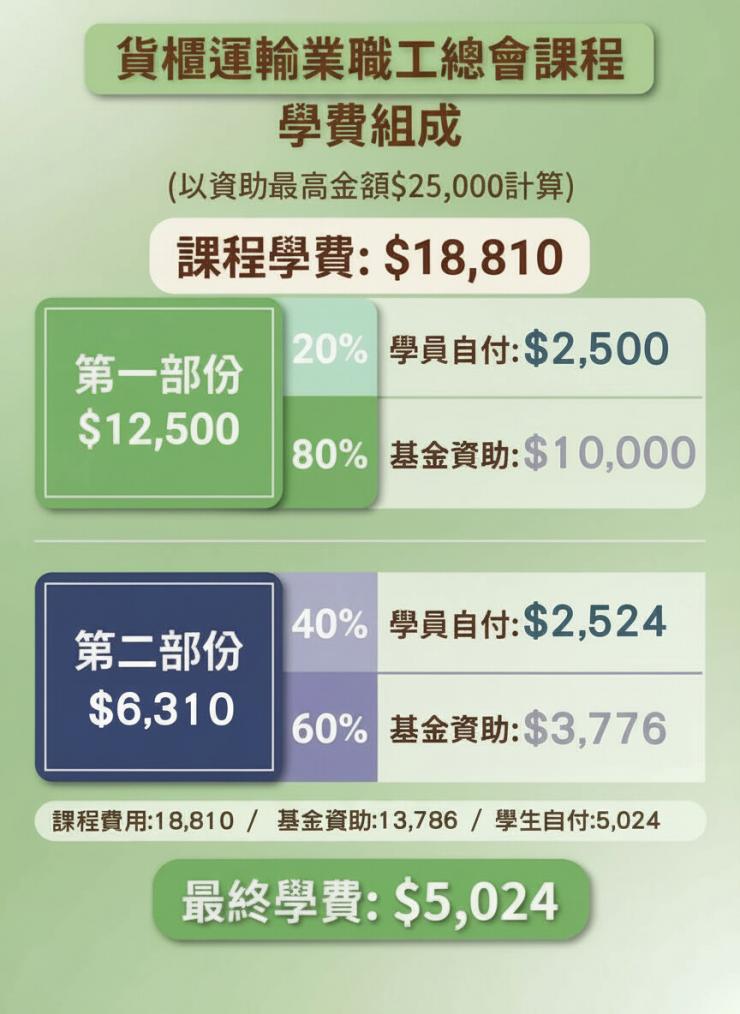 課程學費資助分為兩部分,分別為 $10,000 資助及 $3,786 資助。最終學員自行繳付學費為 $5,024。